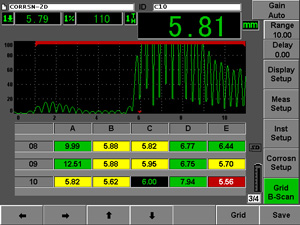 腐蝕模塊還包含一個時控B掃描視圖。這個B掃描的采集基于單個回波或來自回波到回波測量。B掃描可以為最多3個用戶定義的厚度范圍顯示彩色編碼。B掃描用于快速采集潛在缺陷區(qū)域的數(shù)據(jù)并制作綜合性報告。