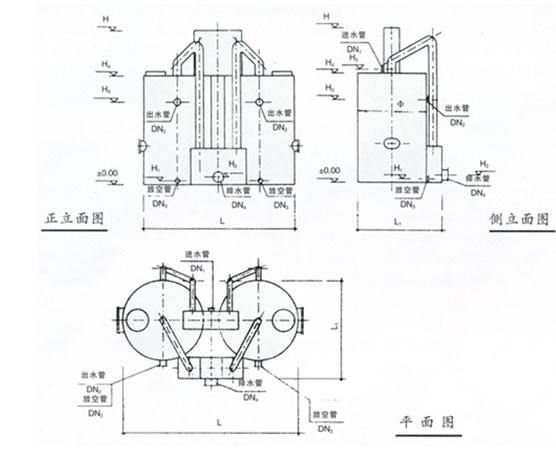 注:處理水量大于150M3/H時,需多格濾罐組成,可根據具體條件靈活布置。設備外形有圓形或方形可選。